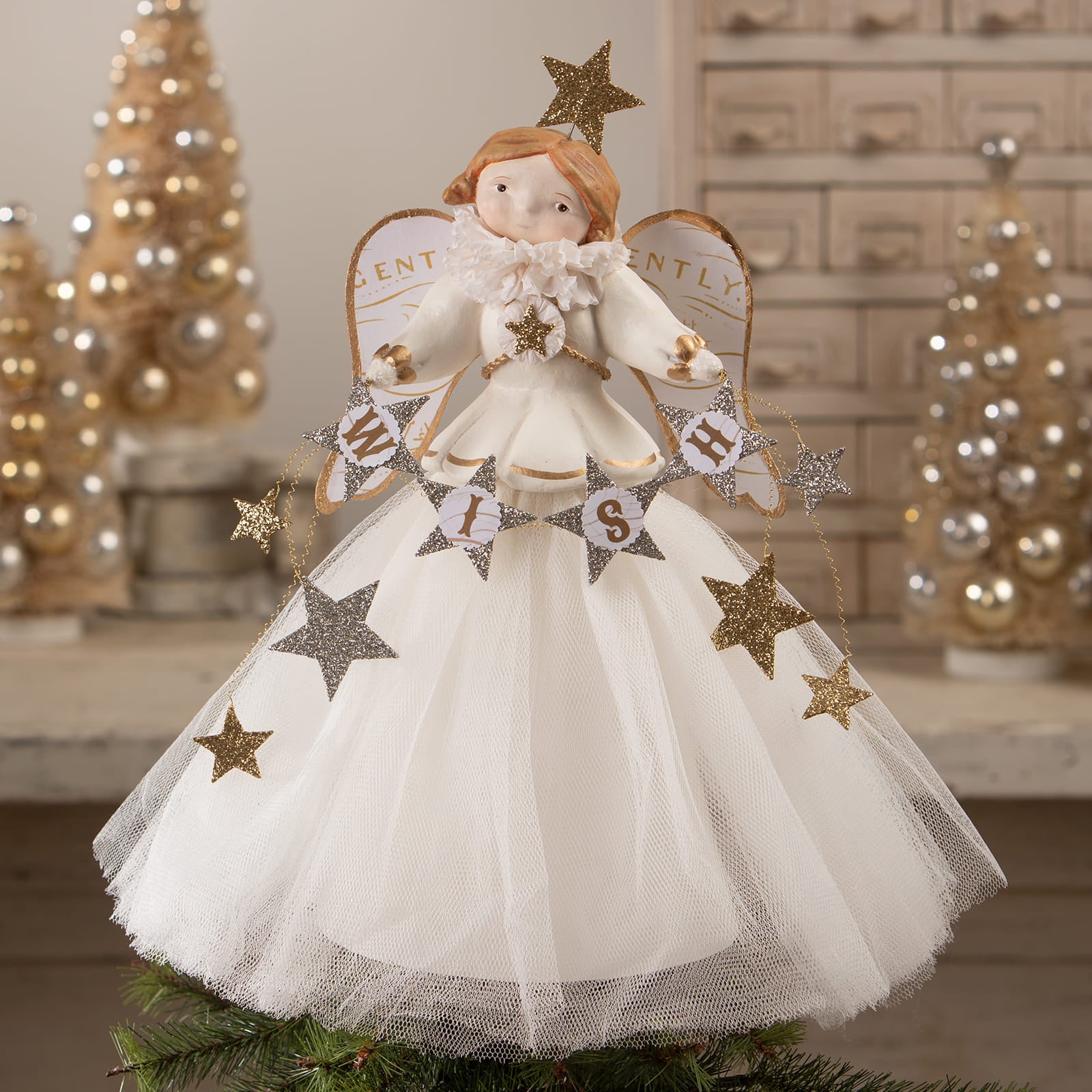 Just like a garland is essential to finishing off the body of a tree, there is no doubt that a tree feels unfinished without a topper placed at the peak. Bethany Lowe has been inspired over the years to make tree toppers of all varieties, including large and small trees or even feather trees. From angels to blown glittered glass toppers, you will find just what you are looking for from Bethany Lowe!