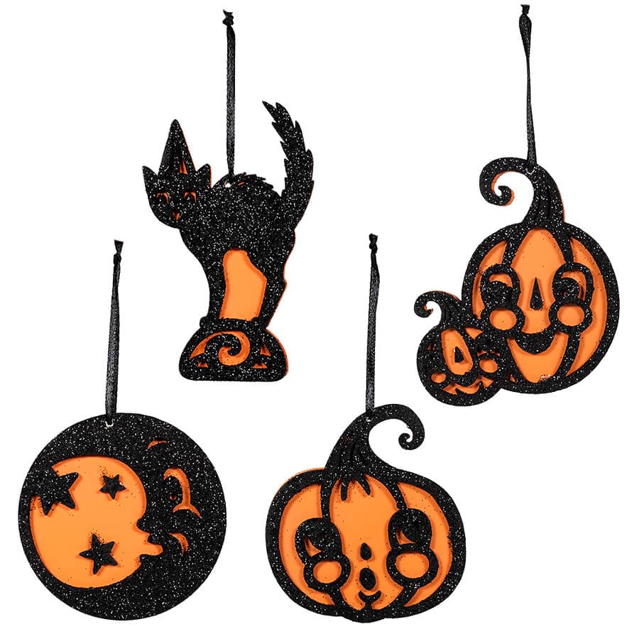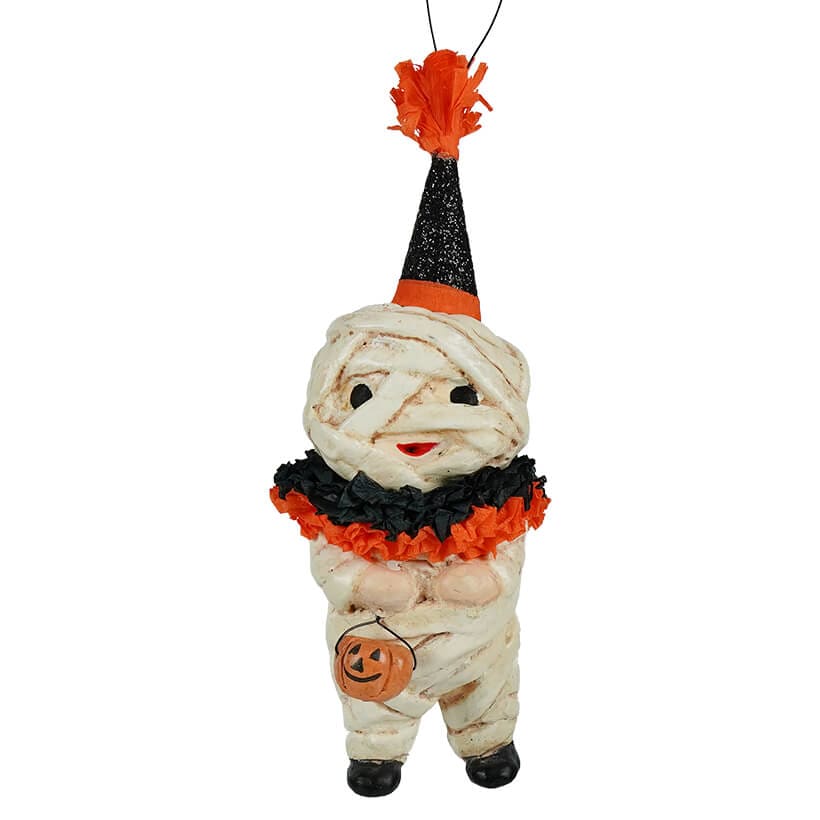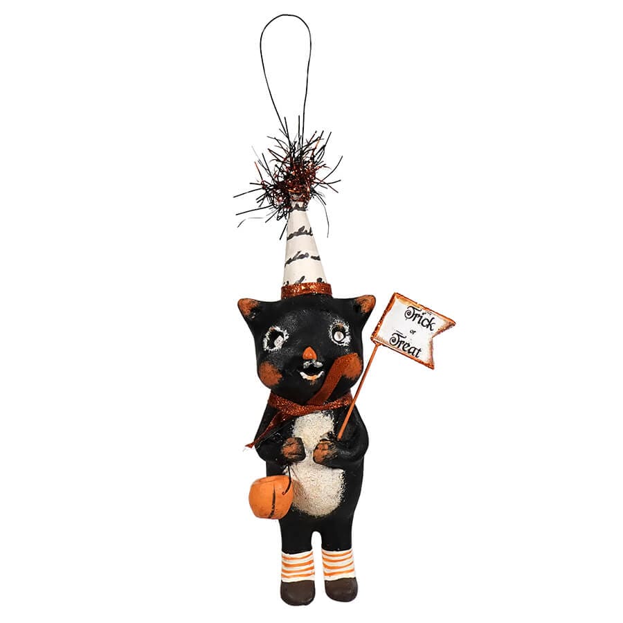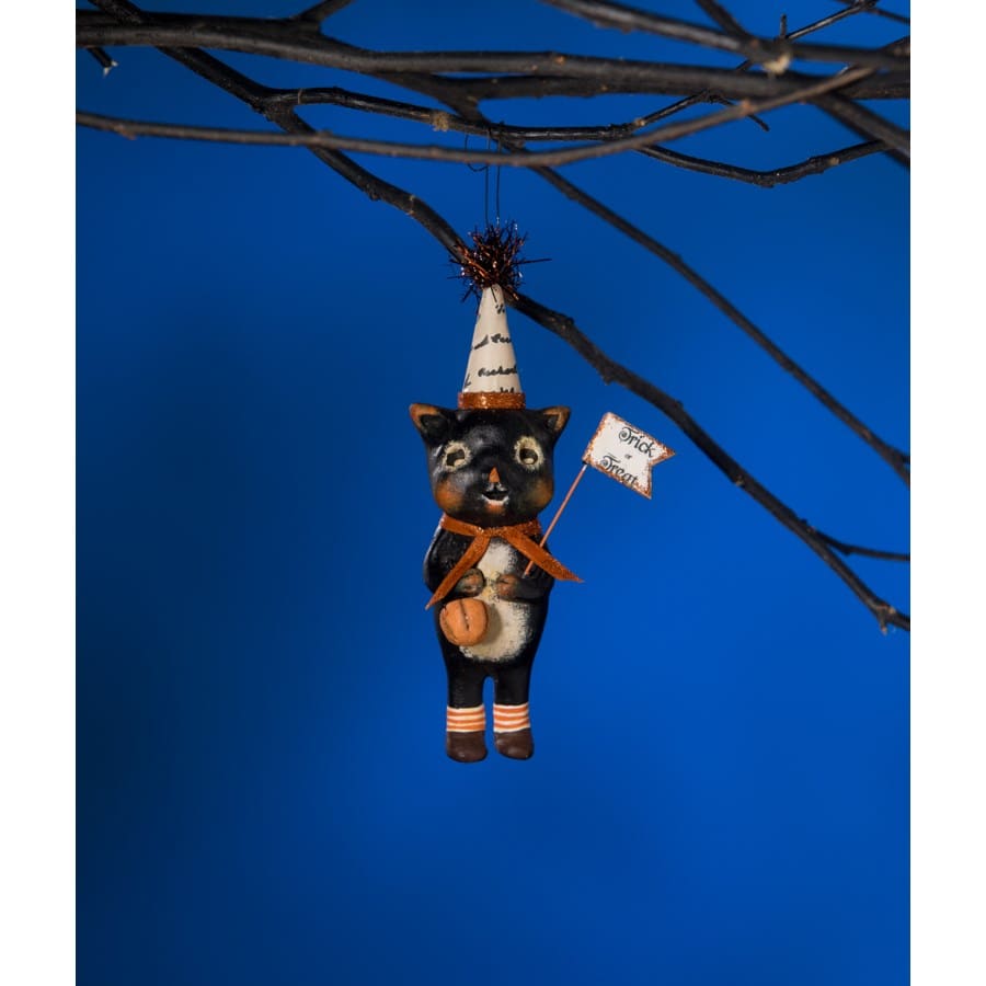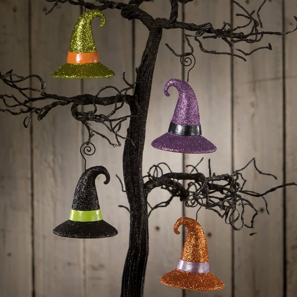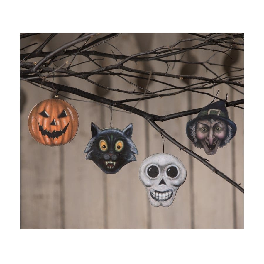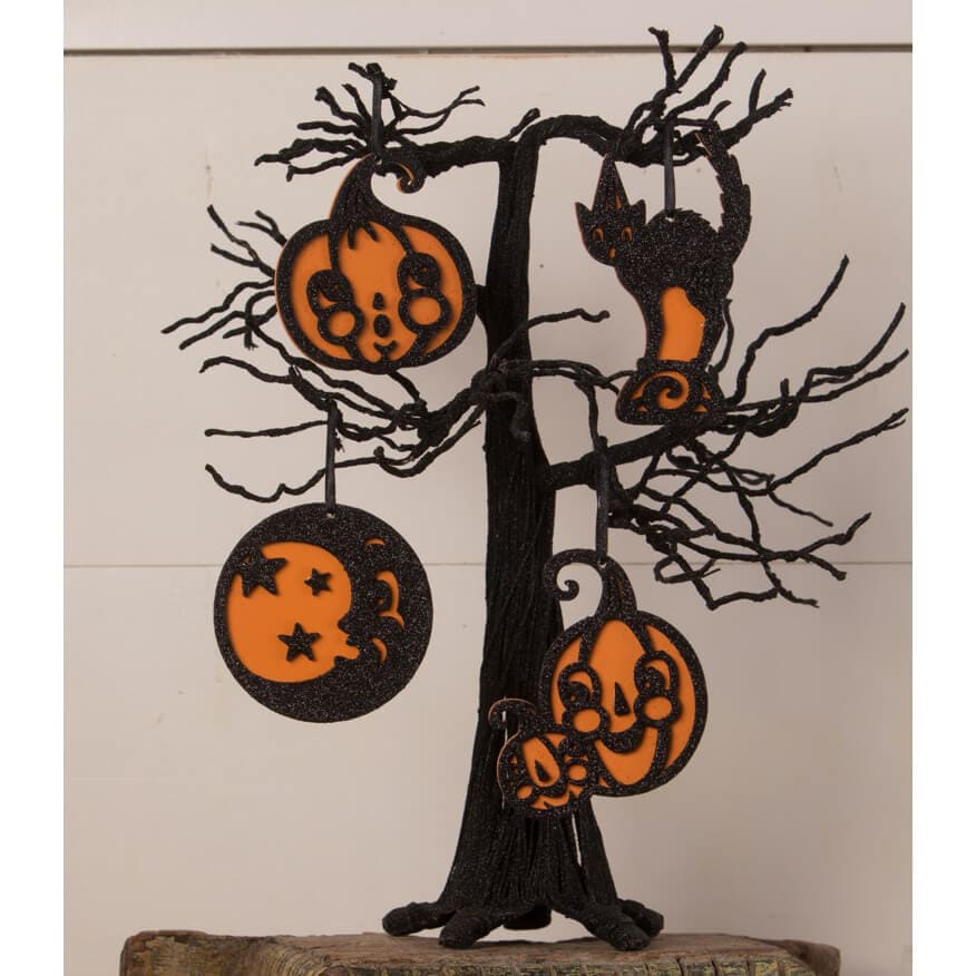 Bethany Lowe has gotten so creative using lots of vintage images as inspiration for ornaments that you can find just about any Halloween theme or figure styled ornaments to decorate your Halloween tree! The artists that design for her have especially come up with clever ornaments made of everything from glass to resin to paper mache that make your tree festive and fun for the holiday. Don’t forget to top your tree with a paper party hat adorned with festooning and vintage images, then finish it off by draping garlands around the tree!