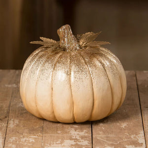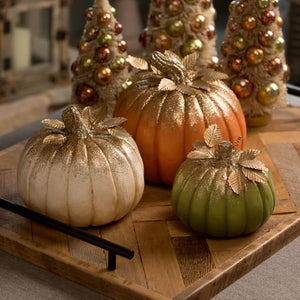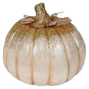 Dressed in a crisp white hue, this pumpkin stands out with its sophisticated simplicity. But it’s the details that make it truly special—the fabric leaves add a lifelike touch, while the stem and top are sprinkled with gold glitter, adding a dash of sparkle that catches the light and enhances its enchanting appeal.