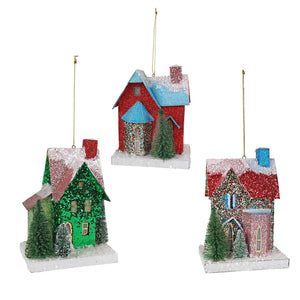 These mini houses come in three distinct colors: a bright green house with a pink roof, a vibrant red house with a blue roof, and a festive pink house speckled with multicolored glitter. Each design is detailed with frosty windowpanes and decorated doorways, giving the ornaments a cozy and welcoming feel. The bottle brush trees flanking each house add a classic touch, reminiscent of vintage holiday decorations.