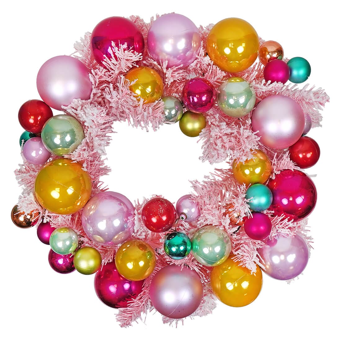 Crafted with meticulous attention to detail, this wreath is a true work of art. Its pastel pink hue exudes warmth and nostalgia, instantly setting a festive tone wherever it's displayed. Adorned with a delightful array of ornaments in varying finishes, from matte to shiny to glittery, it captures the essence of the holiday season in all its shimmering glory.