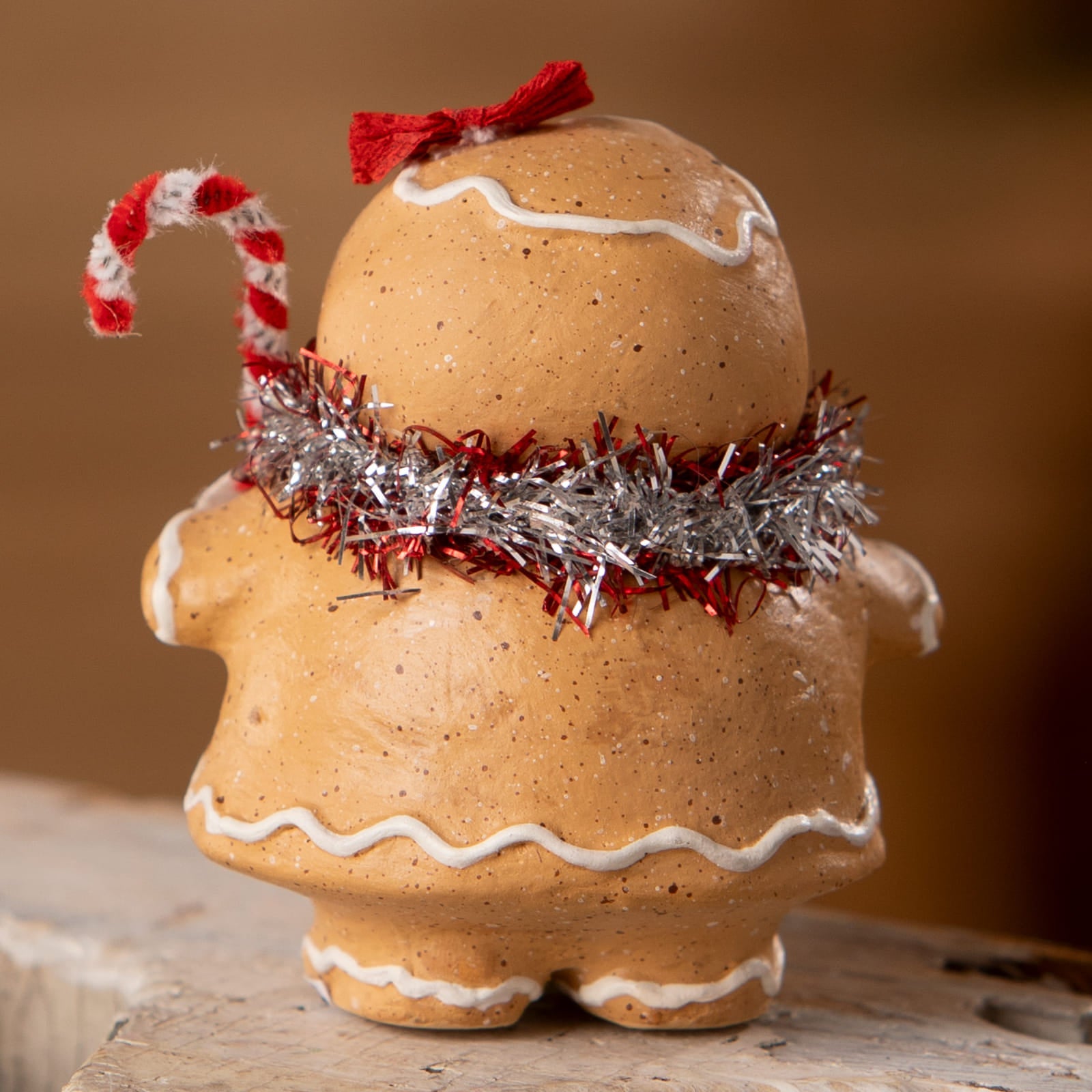 Size: 4.5x4.5x6.5"Material: Claydough, Metal, Glitter, Sisal Tree & Electrical Components