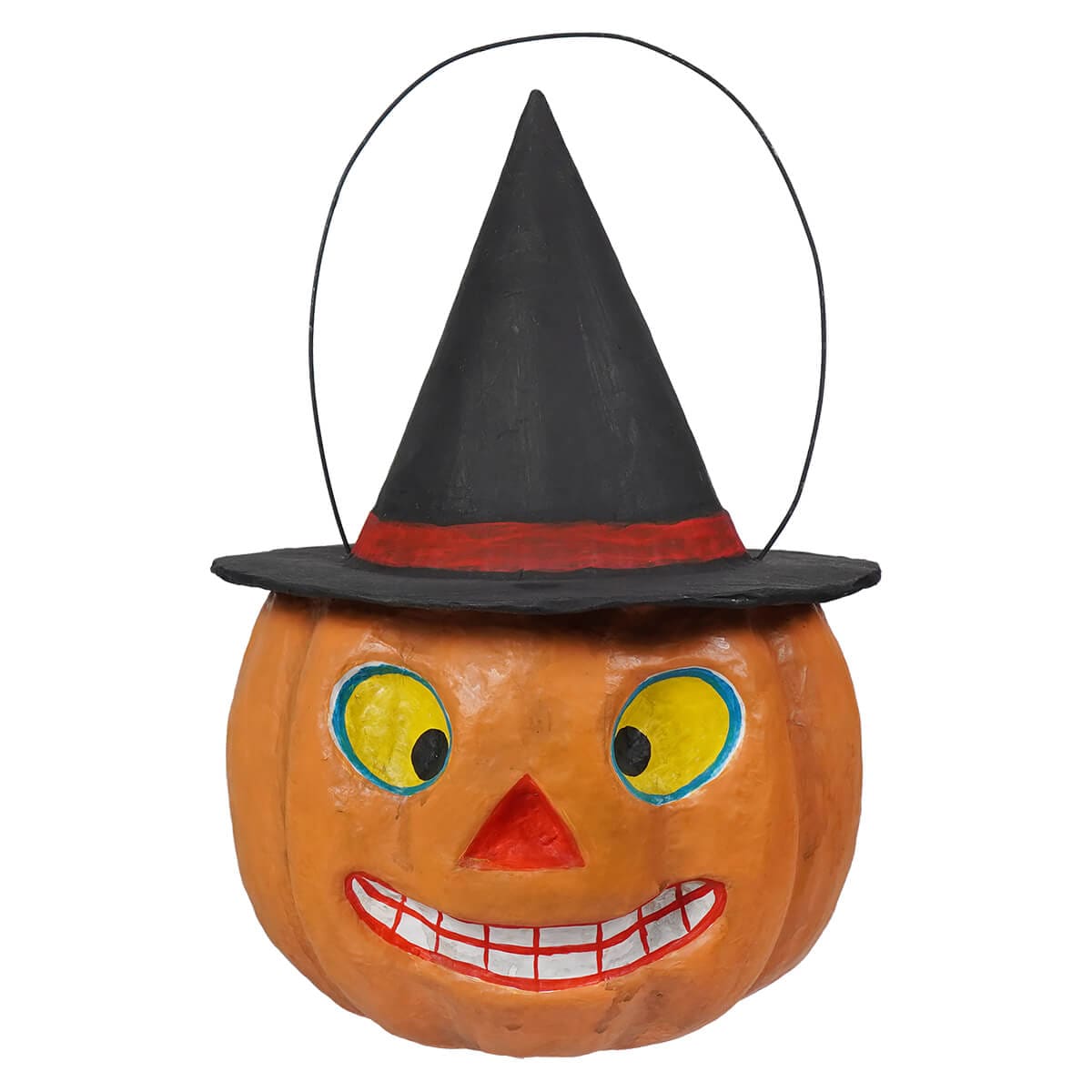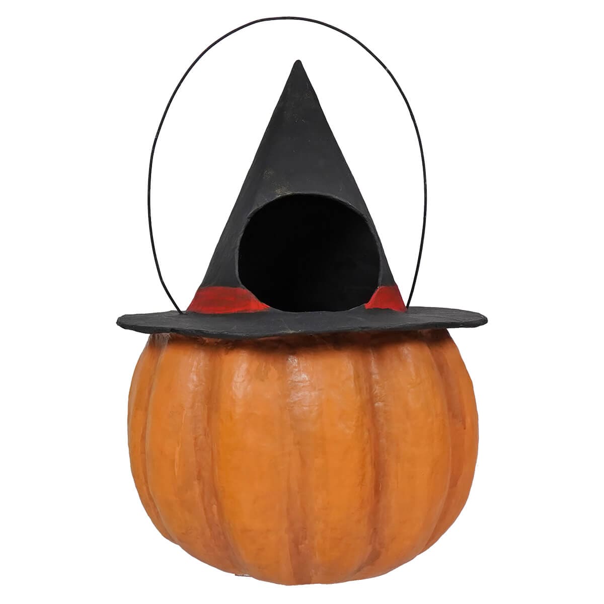 Bring a touch of witchery to your Halloween decor with the Pumpkin Witch with Handle by Cody Foster! This enchanting pumpkin isn't your ordinary jack-o'-lantern—it's dressed to impress in a stylish black witch hat with a convenient handle.
