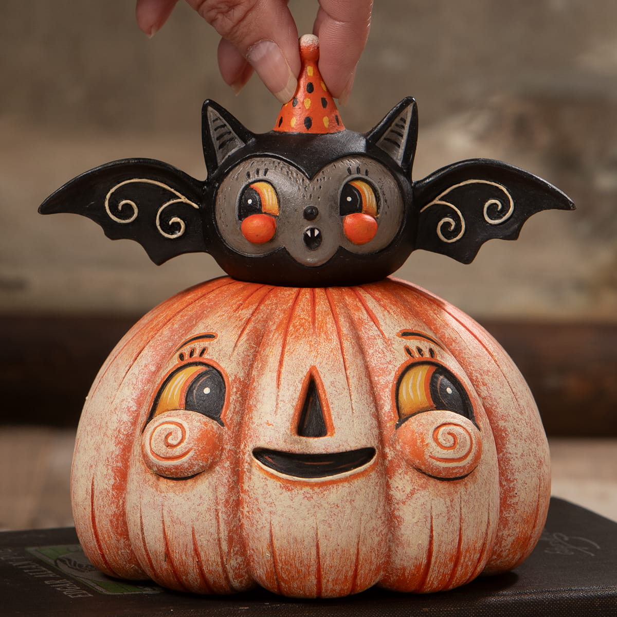 Johanna Parker's paper mache sculptures are imbued with a delightful vintage charm, reminiscent of days gone by. These enchanting figures are adorned with paper and crepe accents, featuring her signature graphic designs, intricate scrollwork, and endearing characters. While Johanna's cast of Halloween characters is vast, you can always expect to find traditional favorites like pumpkins, bats, owls, and black cats, each infused with her distinctive artistic touch. And if you're in for a delightful surprise, keep an eye out for the occasional ghost or Frankenstein's monster thrown into the mix, adding an element of whimsy to her creations.
