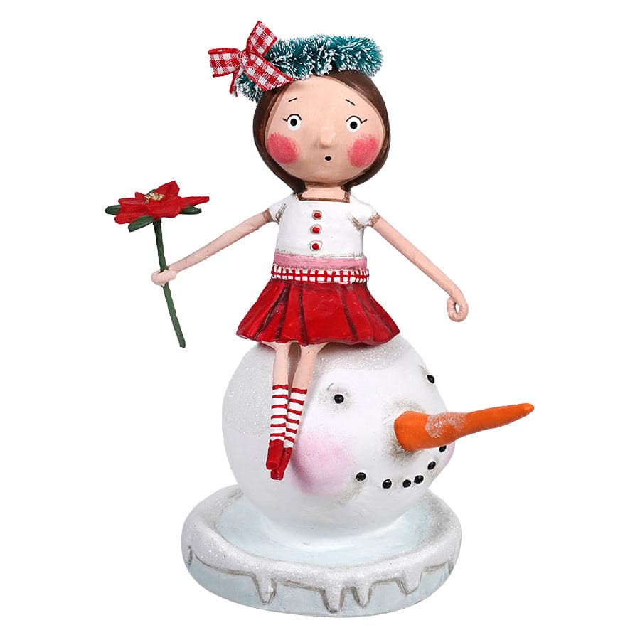 On a frosty December morning, Merry & Bright found herself in the company of a friendly snowman. The snowman had a jolly smile, with a carrot nose and icicles dripping off his snowy base. Merrily, she climbed atop the snowman's head, feeling like a princess perched upon her throne.