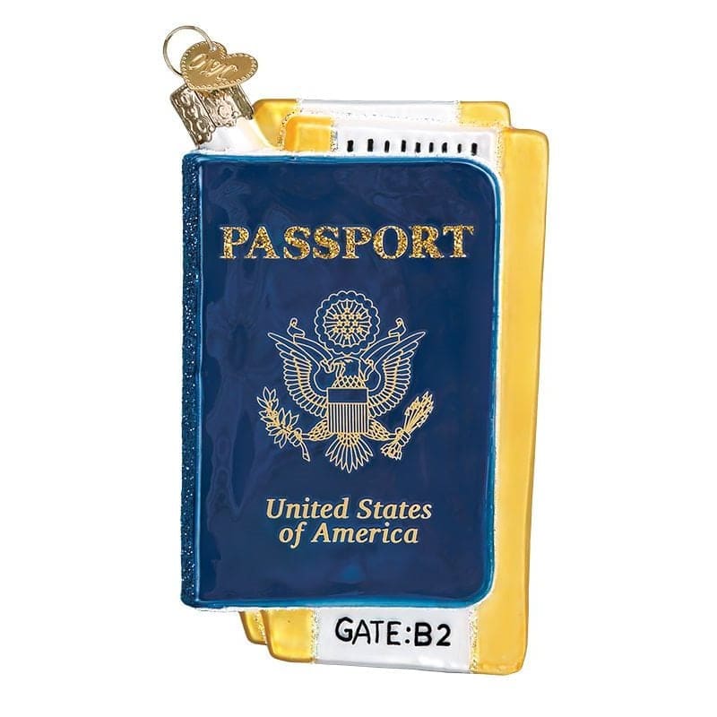 The Passport Ornament by Old World Christmas celebrates the adventures of travel. Crafted from glass and glitter, this 4.5-inch ornament opens doors to new experiences that can be explored world wide.