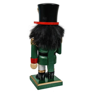 This stout wooden nutcracker, with his expertly painted details, exudes an aura of steadfastness. His crisp black hat, adorned with a golden trim and a regal chain, crowns a face marked by a neatly groomed beard and a mustache, and keen eyes that sparkle with yuletide joy. In one hand, he grips a wooden sword, a symbol of his readiness to protect the joys of the season.