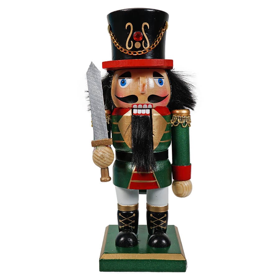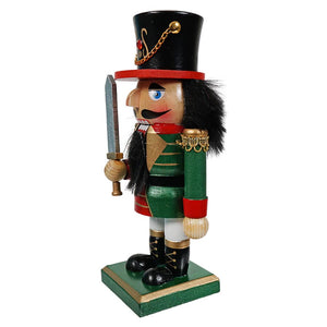Standing at attention, the Green & Red Soldier Nutcracker Yielding Sword is the epitome of festive discipline and holiday spirit. Clad in a classic uniform of vibrant green with bold red accents, this 9-inch tall sentinel is ready to stand guard over your Christmas festivities.