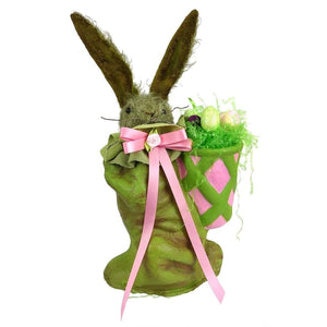 This rabbit has a somewhat aged, unkempt appearance, and its inquisitive face seems poised to wriggle its nose at any second. This bunny is ready to bounce into your heart and your holiday décor, bringing a little springtime cheer wherever it goes, thanks to its tall, expressive ears and basket full of treats.
