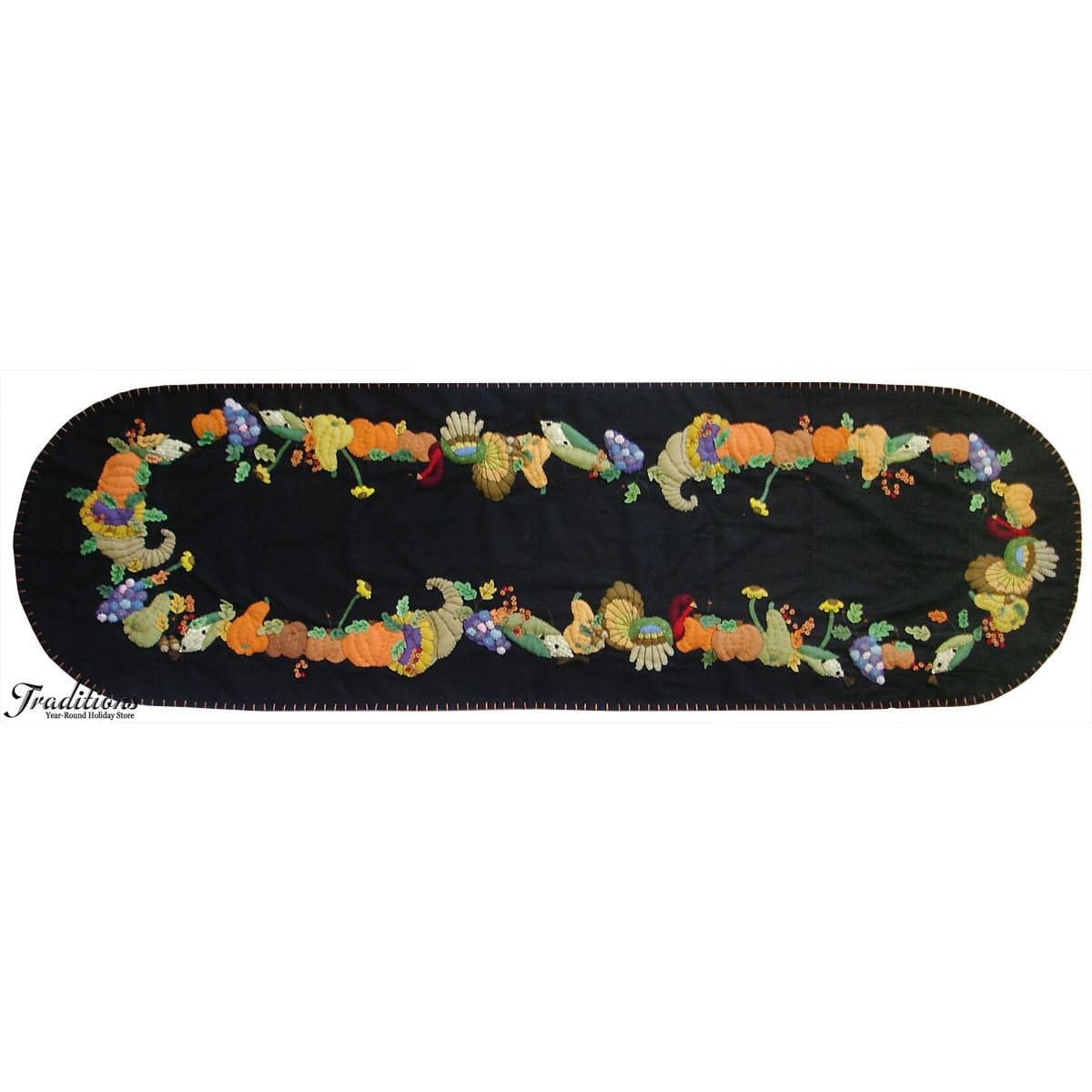 This table runner is one of the largest runners we have, at 70" long, it can fit rather well onto a 7ft to 9ft table. It features a ring of cornucopias and turkeys, all elaborately hand stitched. Each pumpkin and gourd is a different color from it's neighbor, and each turkey has it's own character that shows through the hand stitching.