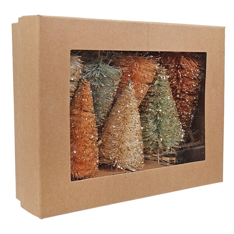 "Spruce" up your seasonal decor with The Fall In Love Mini Bottle Brush Trees Set of 7! A colorful and enchanting addition to your fall and holiday decor. This charming set includes seven miniature trees, each measuring 4.5x2 inches and 3.5x1.5 inches in size. Crafted with care, these trees are made from high-quality bottle brush material, adorned with wooden bases, wire accents, and a touch of glitter. Designed by the talented artist Bethany Lowe, they embody her unique style and attention to detail.