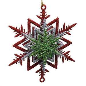 As the saying goes, no two snowflakes are alike, and the Multi Snowflake Ornament takes this to heart. Stacked atop each other, green, silver, and red glittering snowflakes create a captivating multi-colored, multi-dimensional spectacle. This ornament is a celebration of the intricacy and individuality found in nature's frozen wonders.