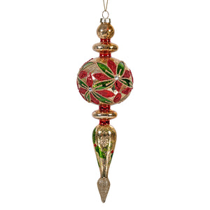 The 10.5" Glass Elegant Holly Finial Ornament by Regency International brings grandeur to your holiday tree with its tall, graceful silhouette. Its shimmering gold body provides the perfect backdrop for richly detailed poinsettias, holly leaves, and bright red berries. At over ten inches, it’s a statement piece designed to stand out among your seasonal décor.
