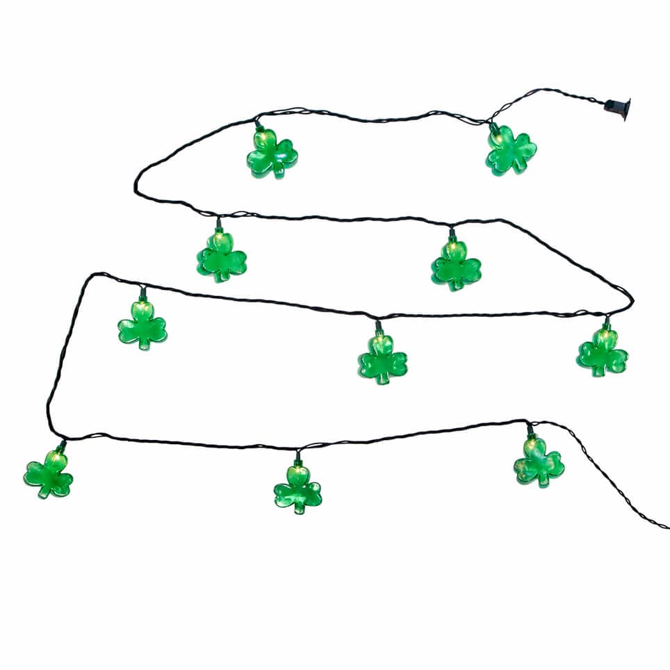 Each green incandescent bulb nestles within a translucent shamrock, creating a warm and inviting glow that's sure to kindle the festive spirit in everyone. Each light is 6 inches apart with a 30 inch lead at the end, making it ideal for draping over doorways, winding around banisters, or laying atop mantels to create an atmosphere of Irish cheer.