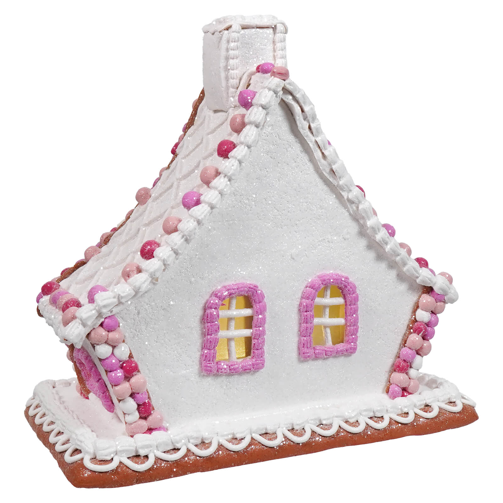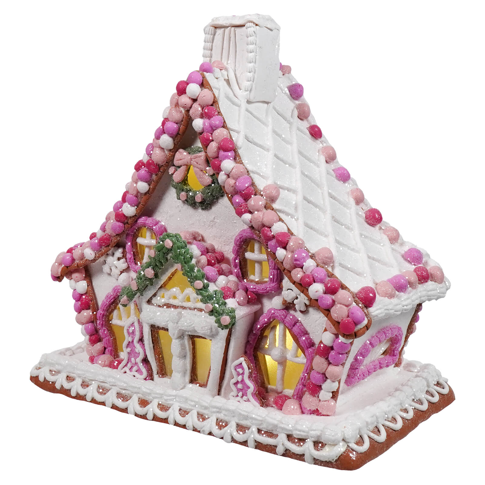 Step into a sugar-coated daydream with the 11" Lighted Pink & White Gingerbread House by RAZ Imports—a confectionary cottage so charming it looks like it wandered straight out of a candy-crafting fairytale and parked itself on your shelf for the season. Lined with pastel pink and snowy white gumdrops, this adorable abode features a perfectly piped wreath and garland over the front door, each accented with petite icing details that make the whole place look freshly frosted and ready to host a gingerbread soirée.