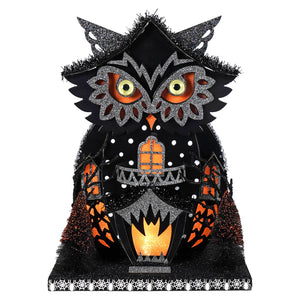 Perched between eerie and elegant, the 12.5" LED Lighted Owl Haunted House by One Hundred 80 Degrees brings a glowing dose of Halloween magic to your décor. The roof itself forms the face of a wide-eyed owl, its piercing gaze keeping careful watch over the spooky scene below. Just beneath that feathery façade, a set of sharp vampire teeth arches over the front door — a chilling grin that dares visitors to step inside.