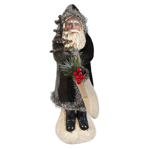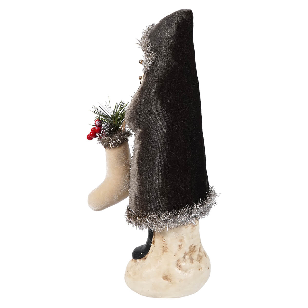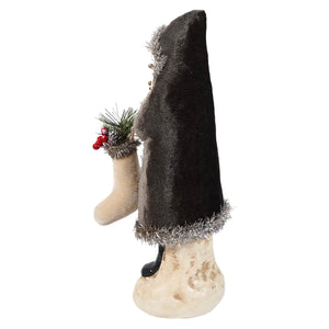 The 12" Charcoal Velvet Belsnickle by Ragon House steps onto the holiday stage dressed like the leading man in a vintage Christmas drama—calm, confident, and covered in the richest charcoal velvet you’ve ever seen. Silver tinsel trims his coat with just enough sparkle to hint that he is festive, thank you very much, but he prefers his celebrations with a touch of old-world gravitas. In one hand, he carries a white stocking stuffed with holly and pine leaves, as if he plucked it straight from a woodland cottage where Christmas magic is brewed in small, potent batches. In the other, he holds a petite Christmas tree, its branches tipped with gold beads that catch the light like stars trying to sneak into the scene.