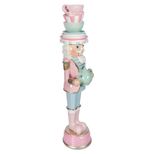 The 15.75" Pastel Resin Dessert Toy Soldier Balancing Teacups by Regency International is reporting for tea duty — and doing it with impressive poise. Dressed in a charming pink, white, and blue uniform with polished details and perfectly styled white hair, this nutcracker is less “battle-ready” and more “tea party fabulous.” In his hands, he carries a dainty blue teapot, while on his head, an elegant tower of pastel plates and teacups teeters with delightful precision.