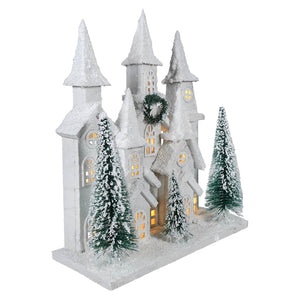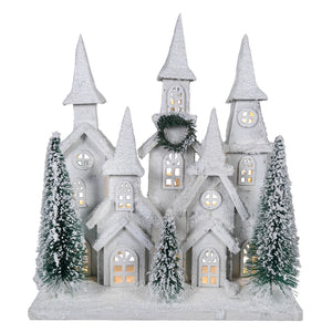 16" LED Lighted Winter Holiday Frosted Wood House With Bottle Brush Trees