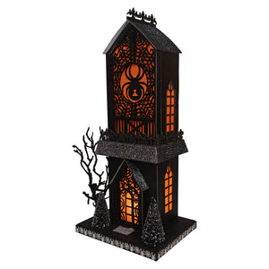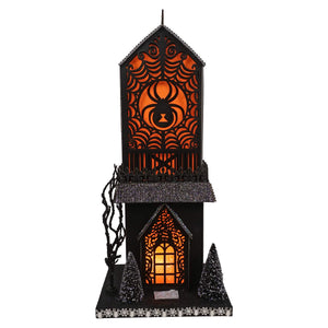 The 17.25" Lighted Spider Haunted Gothic House by One Hundred 80 Degrees is the perfect centerpiece for a spooky, illuminated Halloween display. Painted in classic black and orange, this haunted house glows with eerie charm, featuring a detailed web and a black widow silhouette at the top to send shivers down your spine.