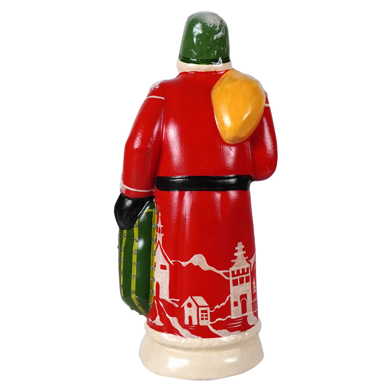 In one hand, he carries a green sack brimming with toys, ready to make the nice list squeal with joy. Over his shoulder, he hauls a sturdy brown sack—likely full of the heavier stuff, like toy trains, teddy bears, or perhaps some coal for that one cousin. Every inch of this chalkware figure is painted with meticulous care, a testament to Vaillancourt’s 40-year tradition of turning plaster into holiday heirlooms.