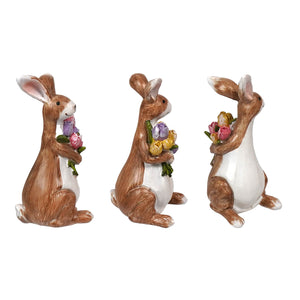 5.5" Resin Easter Bunnies Clutching Spring Flower Bouquets Set/3