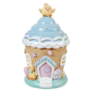 Sweeten up your spring décor with the 6.5" Lighted Resin Easter Chick Blue Ice Cream House by Gerson Companies—a treat for the eyes that won’t melt away! With its swirled blue roof, pastel purple and pink accents, and just the right amount of frosty charm, this delightful little home looks like it was scooped straight from an Easter wonderland.