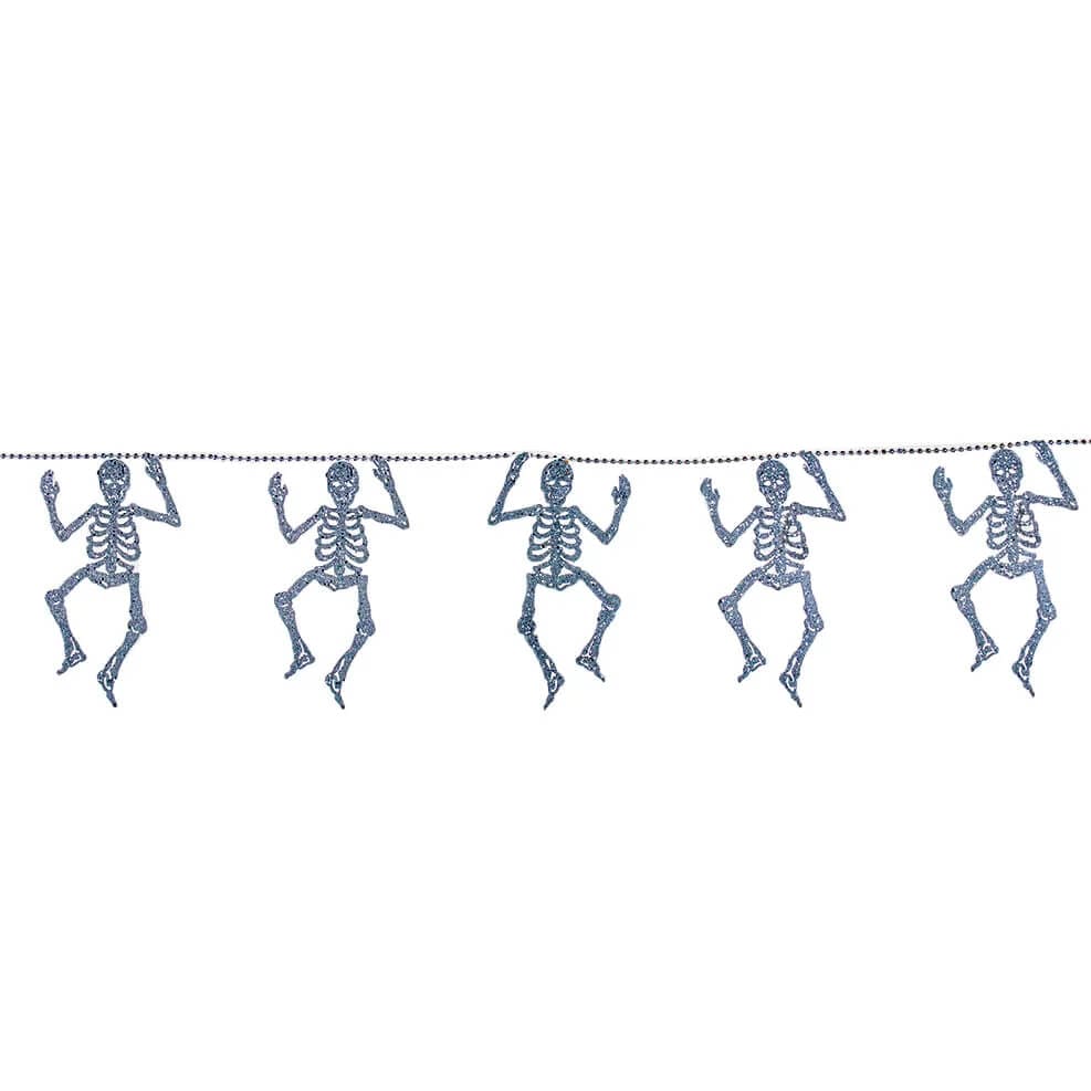 The skeletons are finished in a bright silver glitter, ensuring they catch the light whether hung inside or out. Whether you're draping it across a mantel, stringing it along a porch railing, or looping it around a party table, this garland adds a festive shimmer that's hard to miss.