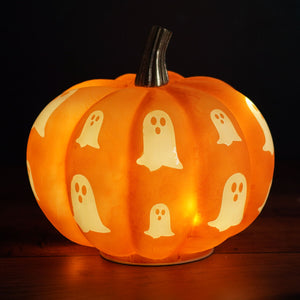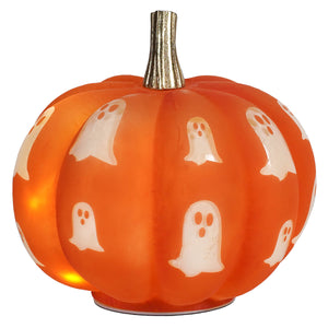 7" Lighted Glass Orange Pumpkin With Spooky Ghosts
