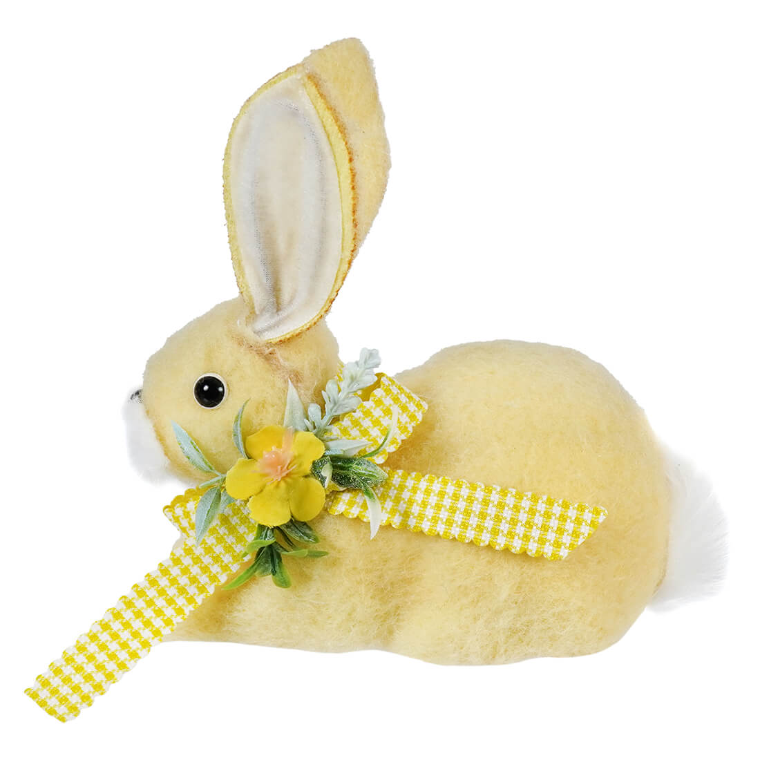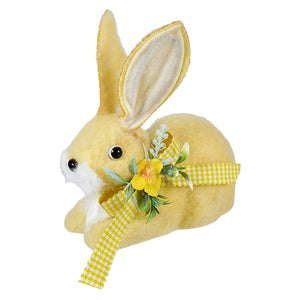 Add a touch of sunshine to your Easter decor with the Yellow Wool Laying Easter Bunny by Gerson Companies. This adorable bunny is lounging in style, ready to spread springtime joy wherever it goes. Dressed in a cheerful yellow gingham bow around its neck and topped with a sweet yellow flower, this bunny exudes all the warmth and charm of the season.