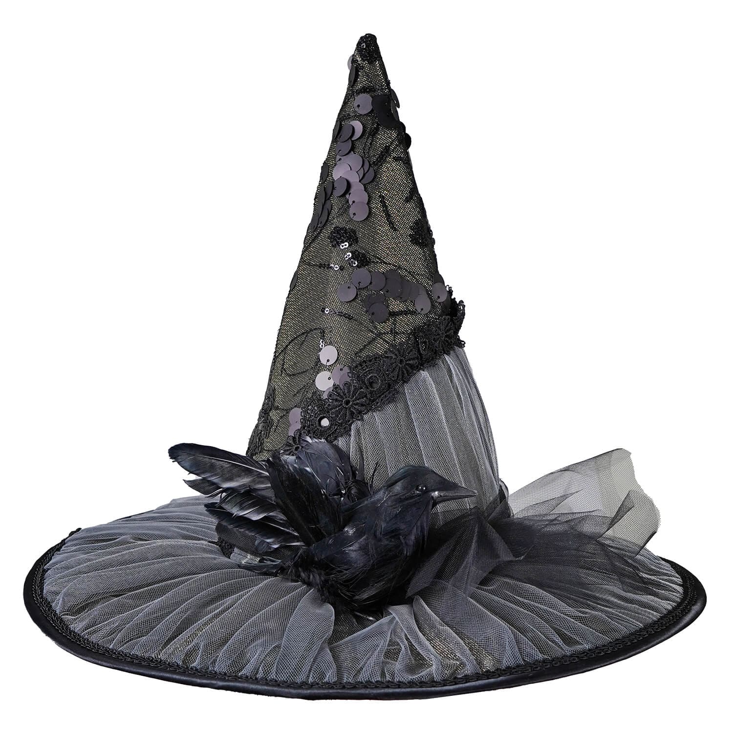 Dressed in a luxurious black gown adorned with sequins and lace, Renda exudes an aura of dark elegance. Her outfit is completed with a magnificent witch's hat, featuring intricate black lace, tulle, and a feathery adornment. This meticulously crafted figure rests on a 15.5-inch diameter metal base, providing stability for her towering form, whether she’s placed indoors or on a covered porch to greet trick-or-treaters.