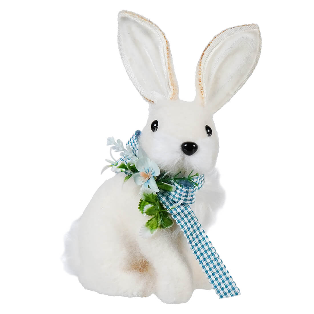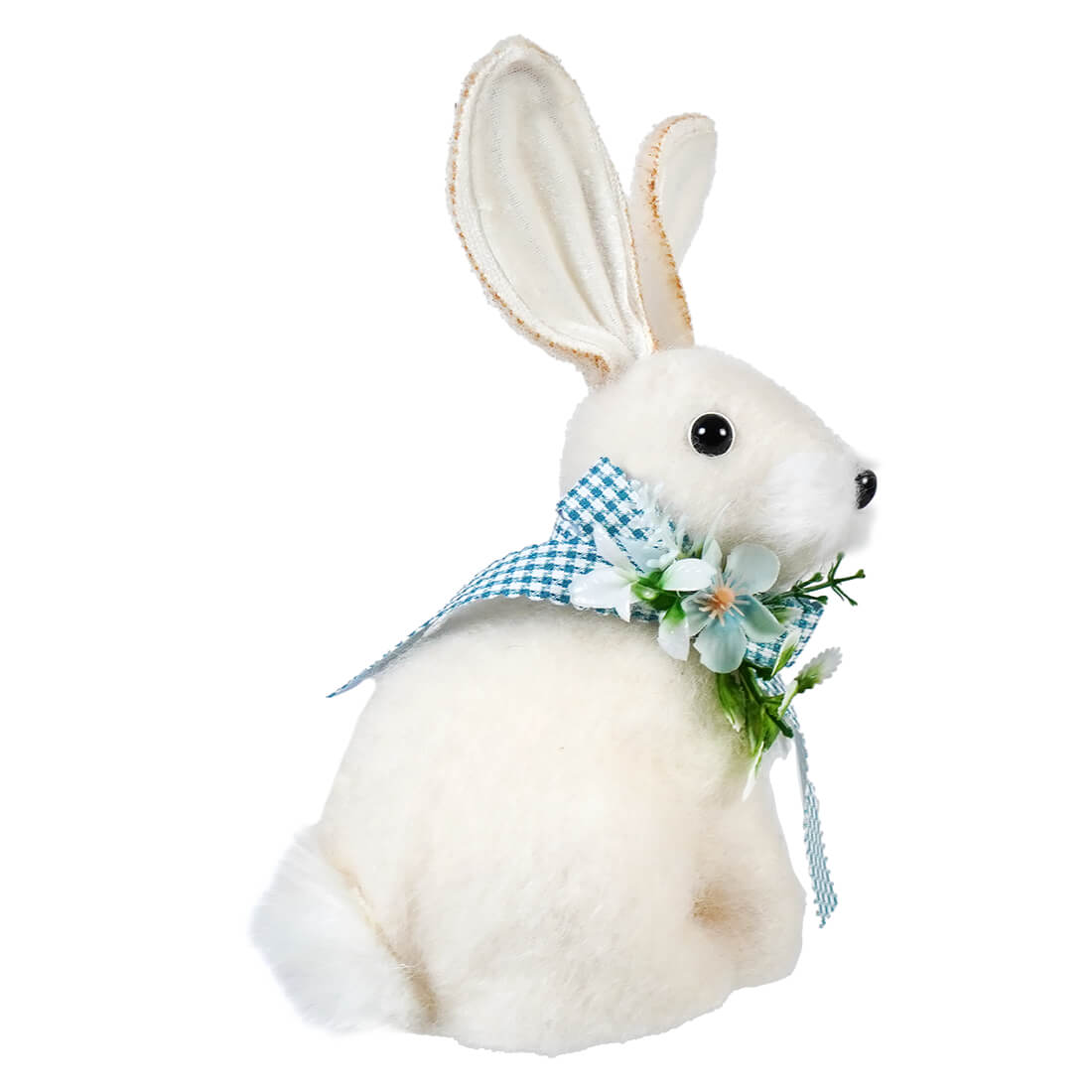 Meet the 8" White Wool Sitting Easter Bunny by Gerson Companies—a fluffy ball of springtime joy that’s here to make your Easter extra special! This charming little bunny is dressed to impress with a classic blue gingham bow tied neatly around its neck, topped off with a delicate blue flower for that extra pop of seasonal style.