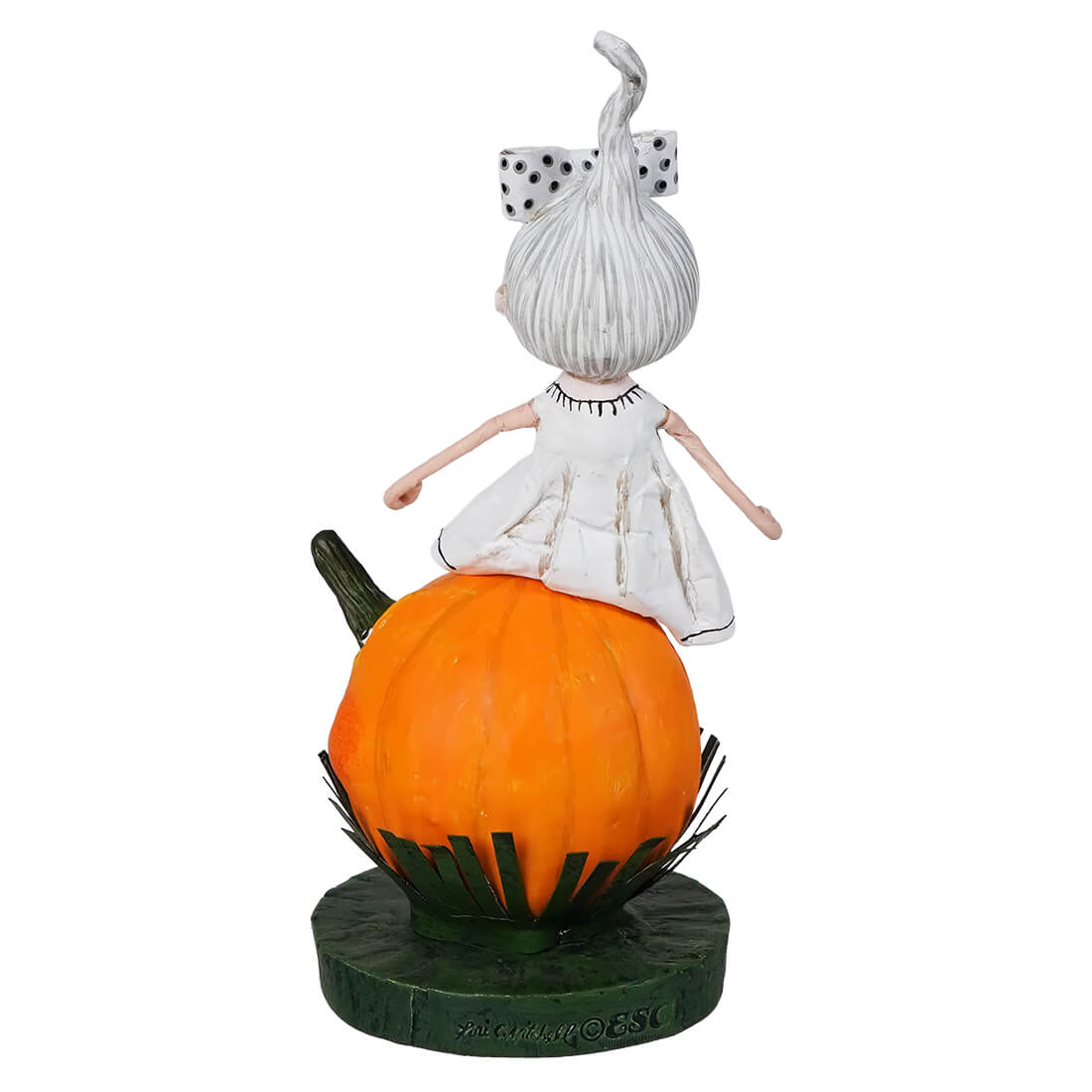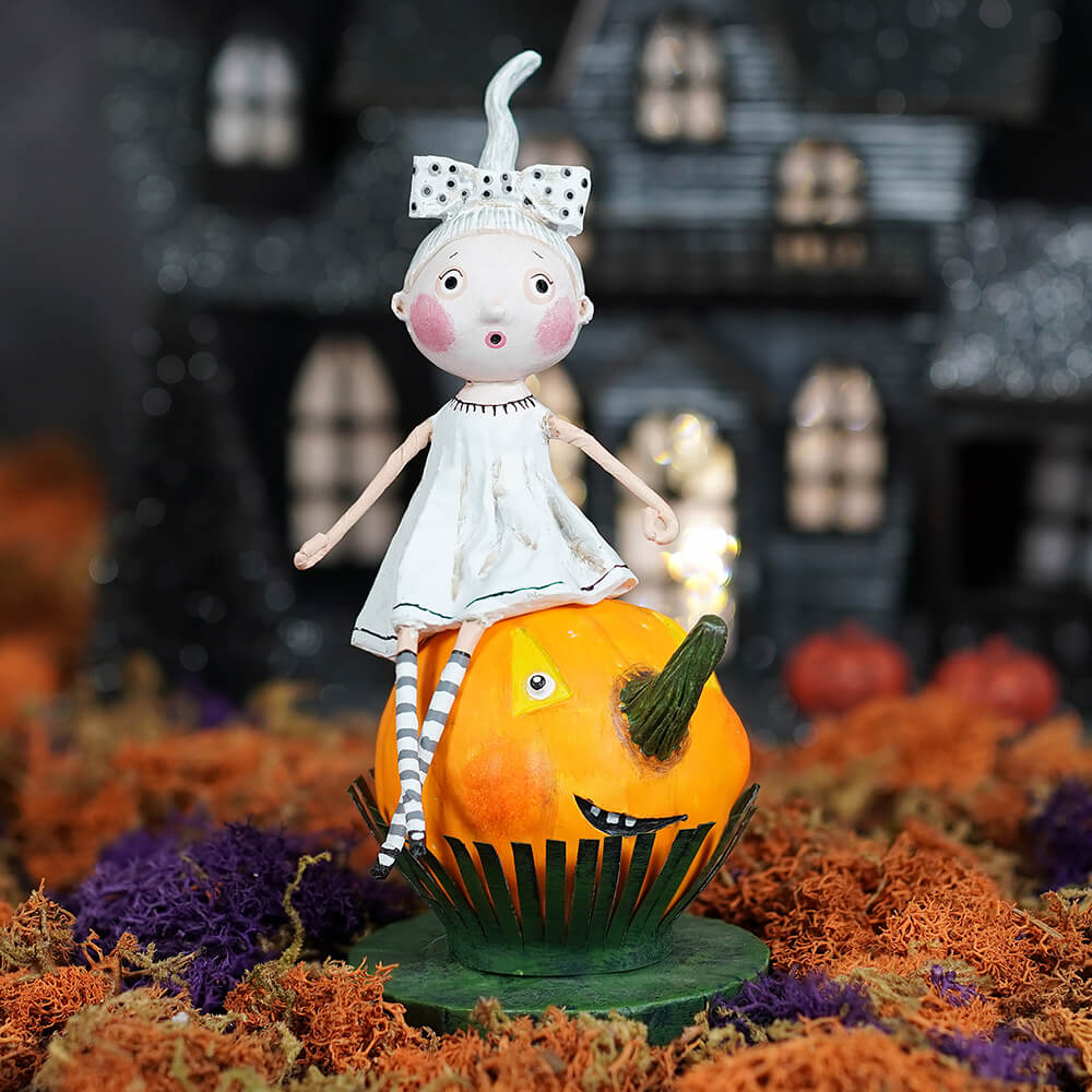 Boo-tiful and ready for Halloween! A Little Halloween Spirit by Lori Mitchell may be dressed as a ghost, but there’s no hiding her charm. With a white-painted face and a flowing white dress, she’s doing her best to look spooky—but those rosy cheeks and wide-eyed expression give her away! Sitting proudly atop a cheerful jack-o’-lantern, she’s more “adorable apparition” than fearsome phantom.