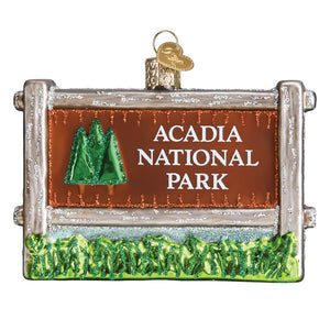 Shaped like the classic wooden park entry sign, this ornament captures the rustic feel of a genuine outdoor excursion. The deep-brown sign, with its clear white letters and old rough-hewn wooden supports, clearly displays Acadia National Park. Hikers, campers, and ecotourists from all over the world come to see the wild terrain that is showcased by two verdant, shimmering mountain peaks to one side.