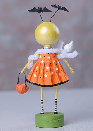 All Hallow’s Moon by Lori Mitchell doesn’t just steal the spotlight—she is the spotlight, thanks to a full moon head that glows brighter than your future (in the cutest way possible). Made from sturdy poly-resin, this figure brings seasonal flair with a style that means business. Her orange dress is sprinkled with white stars and black polka dots, a bold pattern mix that somehow works better than pumpkin spice and everything nice. The black-and-white striped socks add retro flair, because timeless stripes never go out of style—even when you have a literal moon for a head.