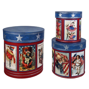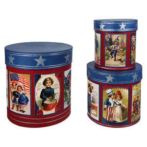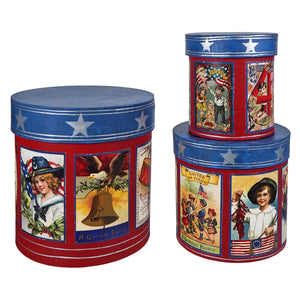 Stacked or solo, these three boxes set the stage. The Americana Nesting Boxes Set of 3 is a celebration in cylindrical form, bright, bold, and decked out in red, white, and blue with postcard-style illustrations that look pulled straight from a vintage collection. Each side panel features a different image, from uniformed drummers to waving flags, wide-eyed children, and Fourth of July greetings that feel like a parade in print.