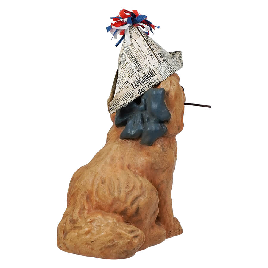 It's almost the 4th of July, so this cute little dog has been dressed by the kids that he lives with in a blue bow and patriotic paper hat! A red, white and blue pom pom on the hat indicates he has a position of pride in the procession. He is hoping that there will be some treats in it for him afterwards if he walks with his owners in the parade! Display him alone on some tinsel grass or together with other patriotic figures.