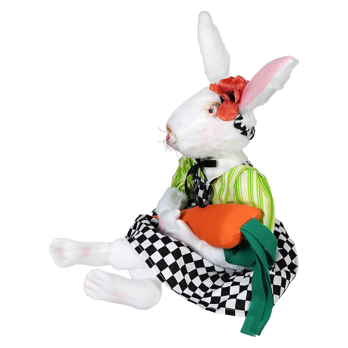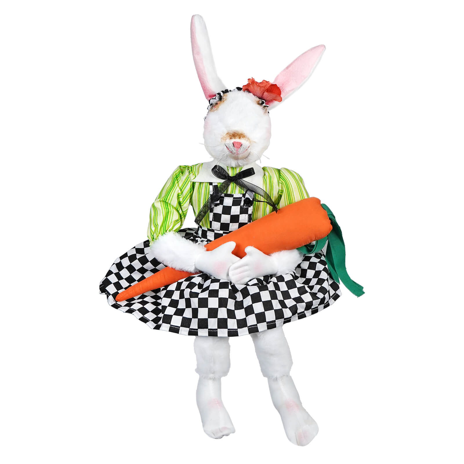 Held securely in its paws is an oversized plush carrot, complete with a deep orange body and soft green fabric leaves. This accessory adds an extra layer of detail, making Angora a standout piece for spring or Easter displays. The long legs allow the doll to be positioned sitting on a shelf, chair, or bench, offering flexibility in how it’s arranged.