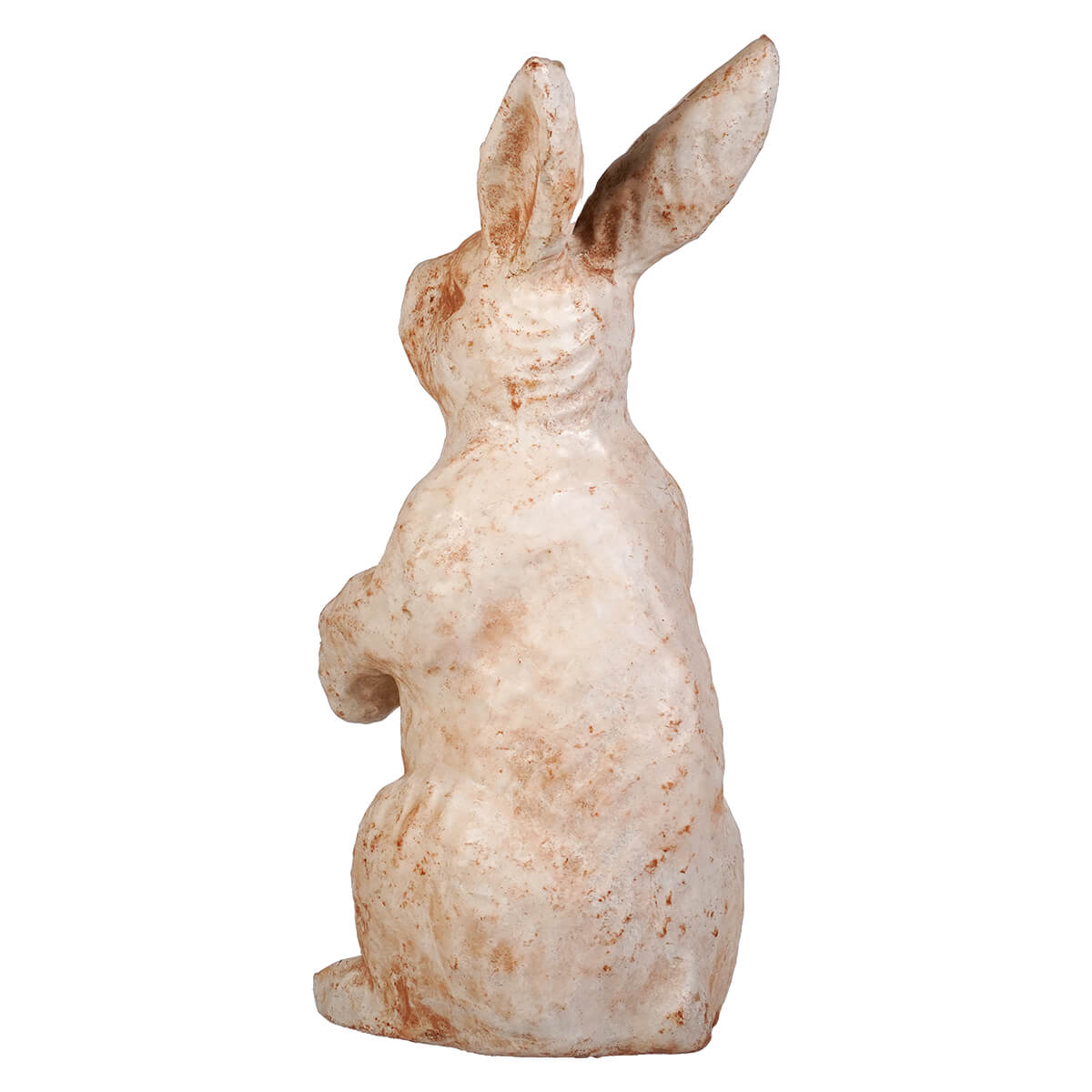 The Antique Ivory Standing Rabbit holds its form with quiet confidence. At 12 inches tall, this figure is built from paper mâché and finished in a textured ivory tone with soft cinnamon accents. Its surface is sealed with a wax coating, giving off a subtle cinnamon aroma that lingers gently in the air.
