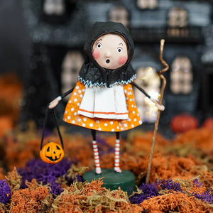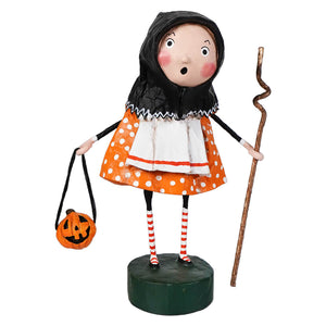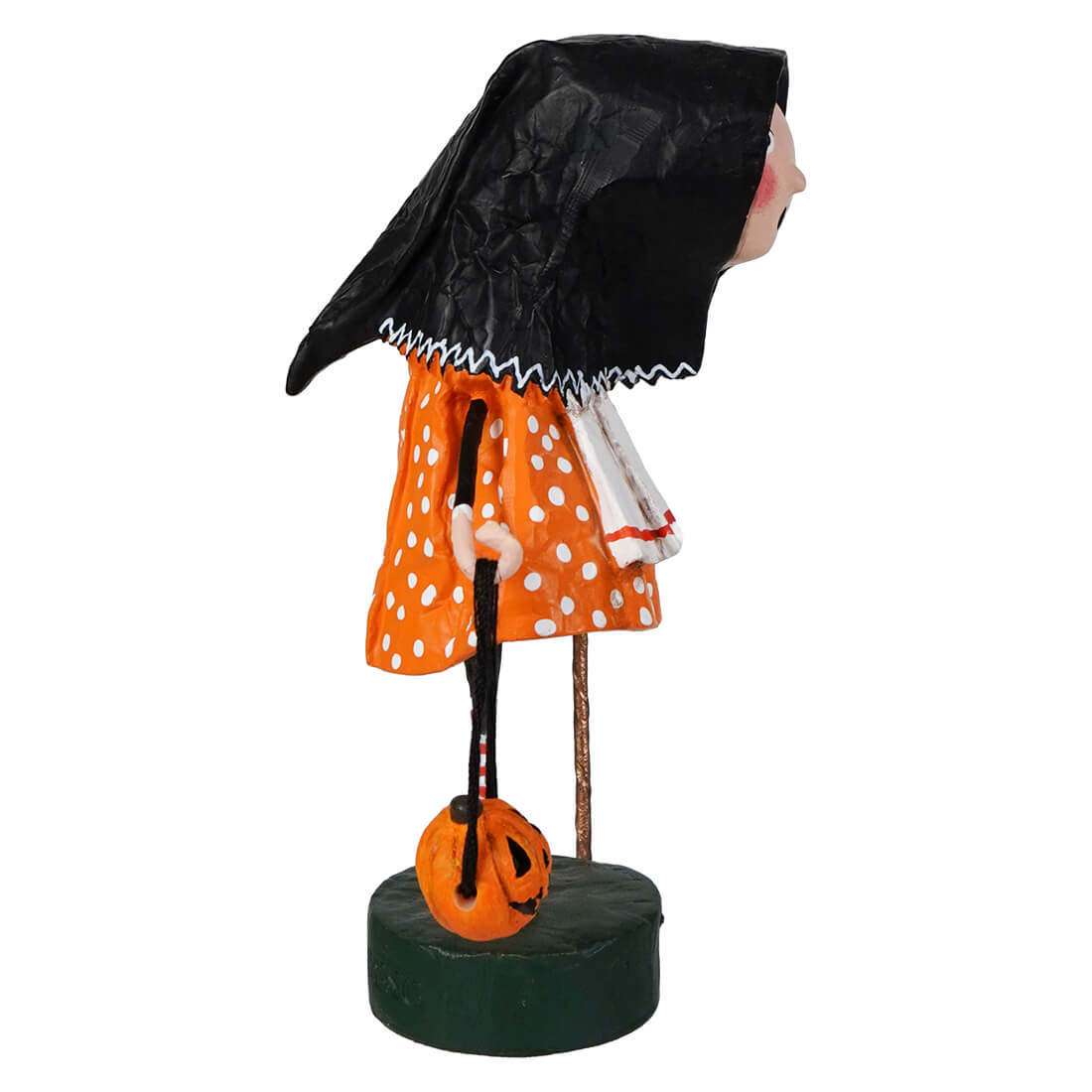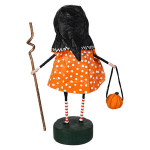 Meet Baba Yaga, the quirkiest crone on the block! This hunched-over Halloween hag by Lori Mitchell may look a little worn from centuries of spell-casting, but don’t be fooled—she’s still got plenty of tricks (and treats) up her sleeve. Dressed in a vibrant orange skirt with white polka dots, a black hood, and a look that says she’s seen everything, she clutches her staff in one hand and a pumpkin candy bucket in the other. Because even witches deserve a little sugar rush!