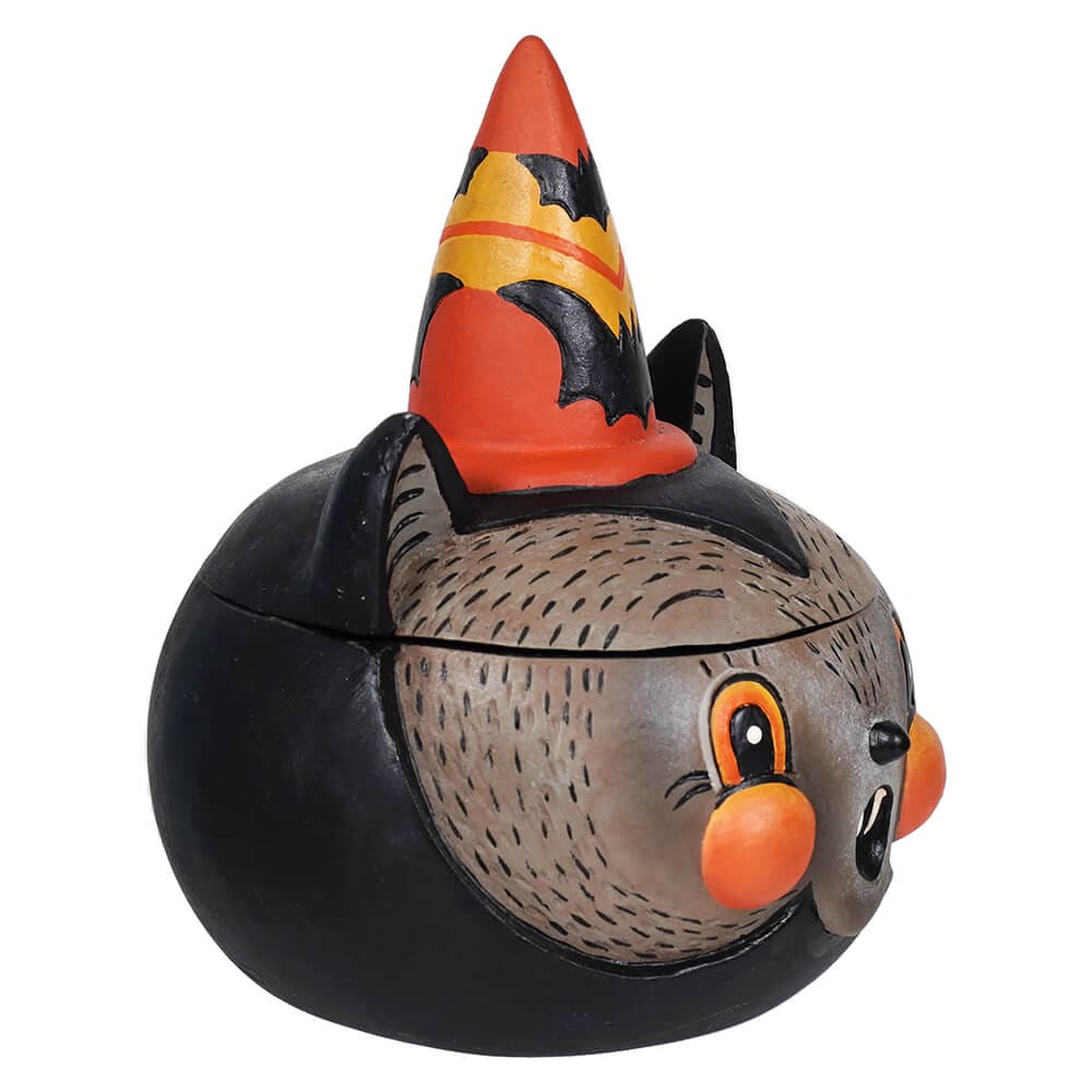 Featuring an orange and yellow party hat adorned with bats, which serves as a clever handle for the container's lid. Lift it up to reveal a secret space perfect for hiding candies or small surprises for your Halloween guests. The container's black and grey textured face, coupled with its vibrant facial features, strikes a splendid balance between spooky and adorable, making it an excellent addition to any Halloween-themed decor.