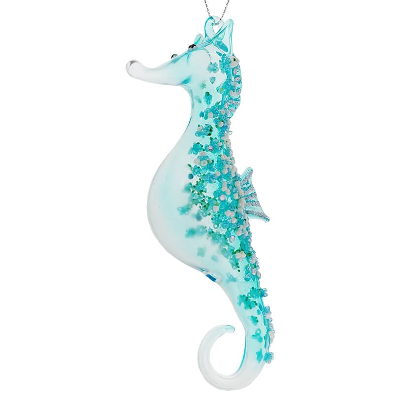Imagine a glass seahorse, the shade of a serene sea, its transparent allure making it the belle of the nautical ball. Now add a glamorous twist – blue and white beads adorning its back, creating a beaded wonder that's as stylish as a sailor's knot. Sprinkle in some blue glitter, and voilà – you've got an ornament that's as dazzling as a starlit night at sea.