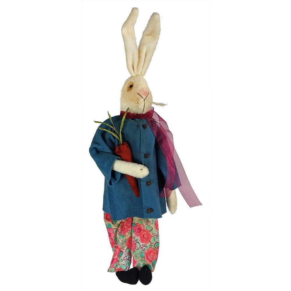 The stylish Benjamin Bunny is the dapper gentleman of the rabbit world! This delightful stuffed fabric figure from Rags A. Muffin Junction stands at an impressive 24 inches tall, making him a standout decoration for your home. Handmade in America, Benjamin is dressed to impress, hoping to catch the eye of his cousins, Maddie and Kaylie.