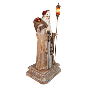 In his hands, St. Nicholas holds a long lantern staff, as if guiding travelers through dark winter nights or illuminating the spirit of giving along the way. This detail adds both height and drama, making the figure an excellent focal point for mantels, tabletops, shelves, or entryway displays. The lantern suggests warmth and protection, reinforcing the comforting traditions associated with St. Nicholas lore.
