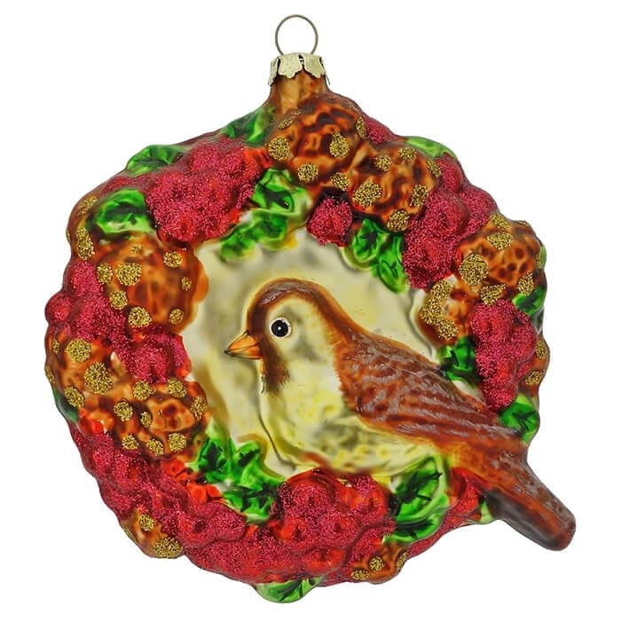 Each glance at this ornament transports you to a peaceful scene where birds find refuge in vibrant wreaths. It's a perfect way to celebrate the beauty of the season and the joys of nature. The German glass construction ensures that this ornament will be a treasured part of your holiday traditions for years to come.