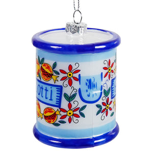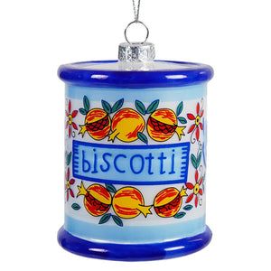 Its sturdy, cylindrical form is painted a bright blue, and around the prominent "biscotti" label in the middle is a colorful pattern of pomegranate fruits scattered with red blossoms and green foliage. The vivid hues and intricate images of this ornament, designed by Cody Foster, this ornament gives your Christmas décor a hint of European flare.