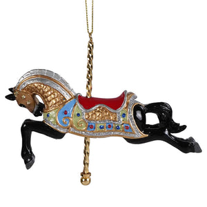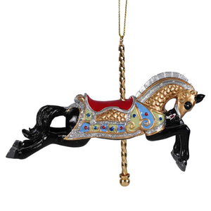 The horse's dynamic attitude is grounded by a twisted, metallic gold rod that runs through the middle of the animal. It is capped and tailed with small, rounded finials, completing the traditional carousel appearance and adding a dramatic touch to any holiday display. With its dramatic, medieval style, this ornament is ready to be placed on a tree or included in a collection of carousel-themed décor.