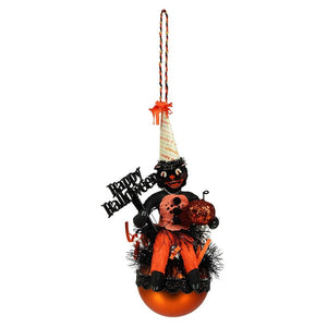Perched high on a gleaming orange ornament, this black cat boy looks ready to lead the Halloween celebration with wide eyes and a glittery pumpkin in hand. The Black Cat Boy on Orange Ball Ornament stands 7 inches tall and is a layered display of seasonal detail, all brought together by Pamela Plant's recognizable spun cotton styling.