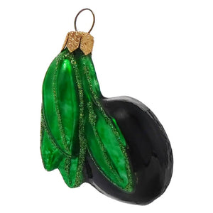 Synonymous with a martini this olive is waiting for a martini to come along with its name on it. The glass Black Olive Ornament is painted a glossy ebony color with bright green leaves. The leaves are lined with an embellishment of green glitter. The minute we saw this ornament we knew we had to carry it in our store, it reminded us of family gatherings where the bowl of olives suddenly was empty and all the kids had the olives on their fingertips, waiting to eat them one by one! Fans of a good olive will be delighted with this mouthwatering decoration!