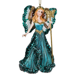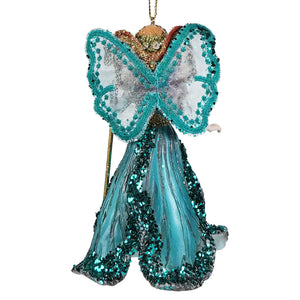 Sculpted from resin, the figure wears a deep teal dress that curves and folds like butterfly wings. The bodice is smooth, trimmed in gold glitter, and the skirt flares at the bottom with heavy sequin detailing that catches every bit of light it can find. The sequins are bold, irregular, and layered, shifting between shades of teal as the ornament moves.